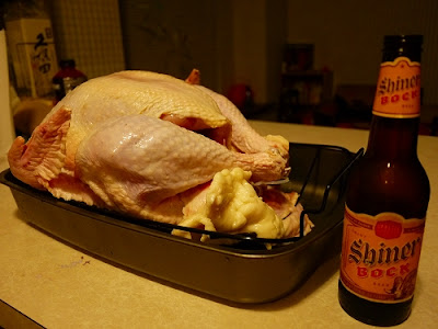 最初に塩と胡椒をたっぷりと使い、ターキーがくすぐったいと叫ぶ位、特に腹の中に一生懸命塗りたくる。